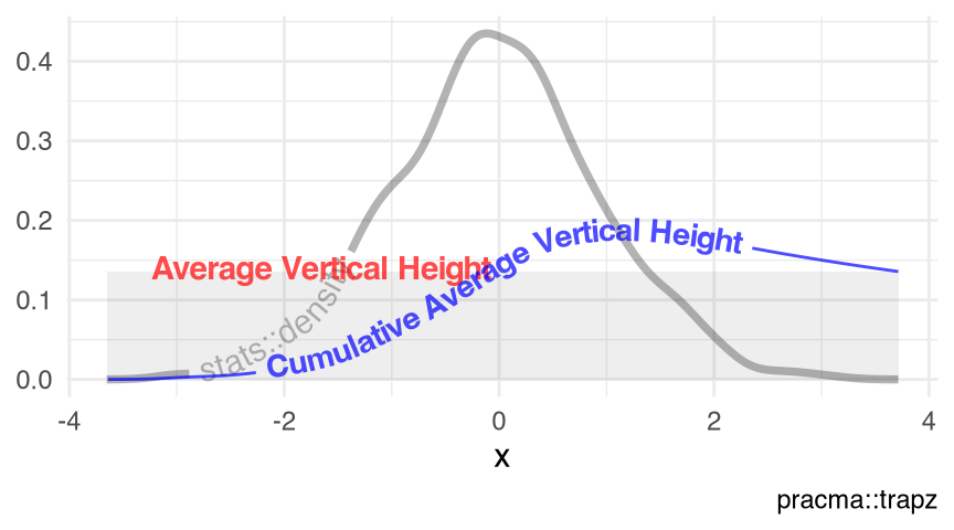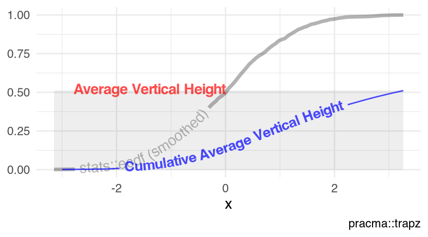 Figure 11.4 visualizes the empirical cumulative distribution function ecdf() of a random normal sample of size 1e3L, using the objects x and y in the enclosing environment. Obviously, this practice is meaningless mathematically, as a distribution function has an \(x\)-domain of \((-\infty, \infty)\), thus the (cumulative) average vertical height of the trapzoidal integration under a distribution curve should be a constant of zero. This practice is meaningful to an empirical distribution though, if we use the range of the actual observations as the \(x\)-domain.