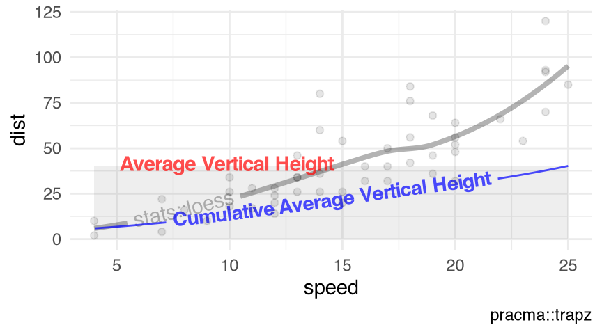 - the \((i+1)\)-th element of \(i^{-1}(y_0/2+\sum_{k=1}^{i-1}y_k+y_i/2)\), if \(\{x_k;k=0,\cdots,i\}\) are equidistant, i.e., \(\forall k\in\{1,\cdots,i\}\), \(\Delta x_{k}\equiv \Delta x\). Note that the R does not use zero-based numbering; i.e., R