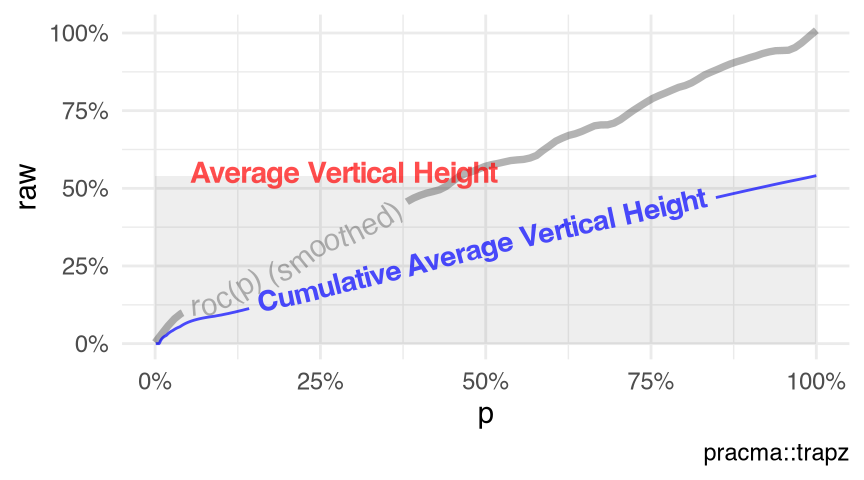 - the average vertical height of the trapezoidal integration under the ROC-curve of a point-pattern, via function