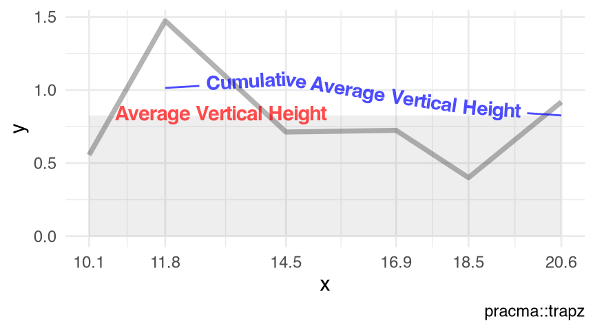 The function vtrapz() (Listing 11.6) calculates the average vertical height of a trapezoidal integration (Equation 11.2). The (tentative) prefix v indicates “vertical”. The shaded rectangle in Figure 11.1 has the same area as the trapezoidal integration. Therefore, the vertical height of the shaded rectangle is defined as the average vertical height of the trapezoidal integration.