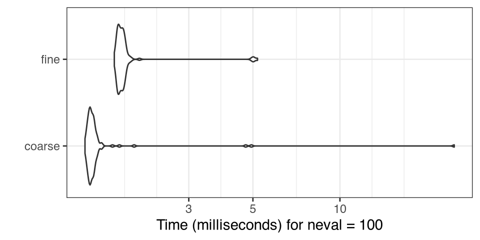 An experienced reader may wonder: is it truly advantageous to compute a coarse function-value-table sprucesK$coarse and then perform interpolation (Section 20.6.1) and/or smoothing (Section 20.6.2), rather than computing a fine function-value-table sprucesK$fine to start with? This is an excellent question! As of package spatstat.explore (v3.8.0, GPL (>= 2)), we observe only minor increase in the computation time of the creation of a function-value-table, even when the grid of the \(r\)-vector is 100 times finer (Listing 20.35, Figure 20.14) via package microbenchmark(Mersmann 2024, v1.5.0, BSD_2_clause + file LICENSE). This observation justifies the use of the plain-and-naïve trapezoidal integration (Chapter 11, Section 11.2) on a fine function-value-table (Figure 20.6, Right), rather than employing more sophisticated numerical integration methods, e.g.,