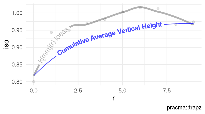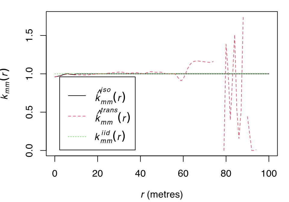 spruces_k |> spatstat.explore::print.fv()# Function value object (class 'fv')# for the function r -> k[mm](r)# ................................................................................# Math.label Description # r r distance argument r # theo {k[mm]^{iid}}(r) theoretical value (independent marks) for k[mm](r)# trans {hat(k)[mm]^{trans}}(r) translation-corrected estimate of k[mm](r) # iso {hat(k)[mm]^{iso}}(r) Ripley isotropic correction estimate of k[mm](r) # ................................................................................# Default plot formula: .~r# where "." stands for 'iso', 'trans', 'theo'# Recommended range of argument r: [0, 9.5]# Available range of argument r: [0, 9.5]# Unit of length: 1 metre