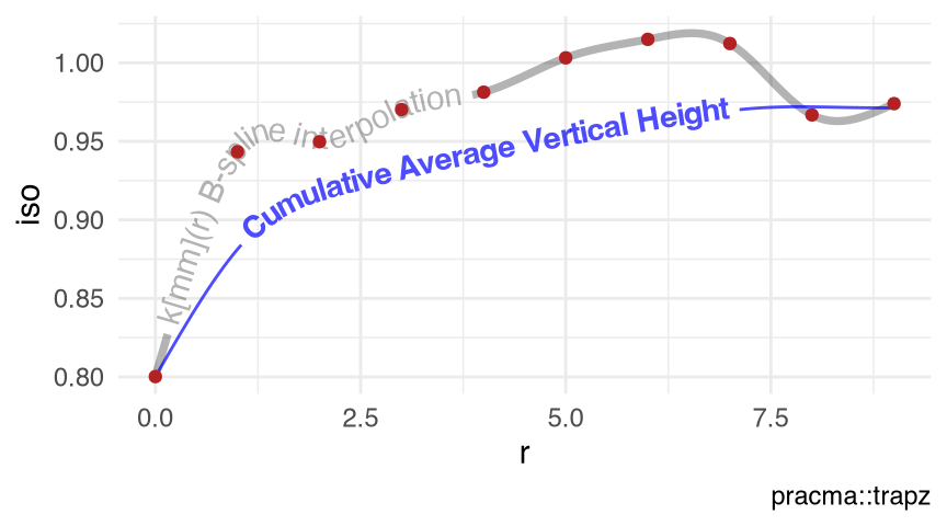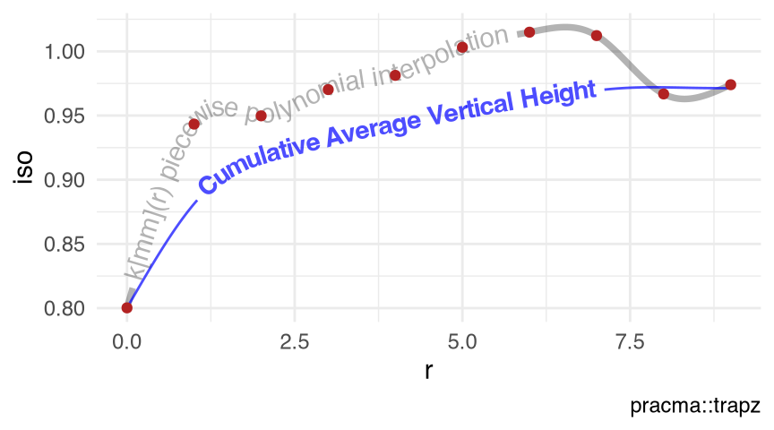 The S3 method visualize_vtrapz.fv() (Section 11.3, Table 11.2) visualizes the cumulative average vertical height of the trapezoidal integration (Section 11.2) under the recommended function values